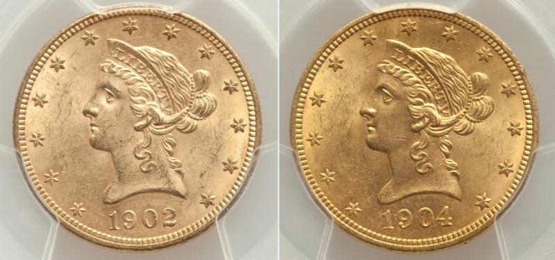 A pair of very pretty $10 Liberty Head Eagles in PCGS MS63 holders.