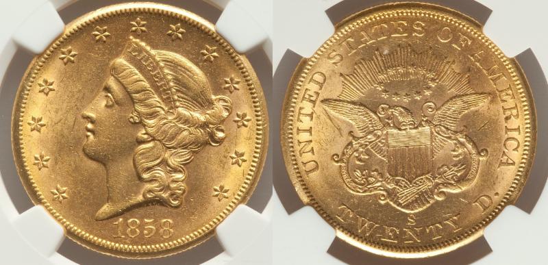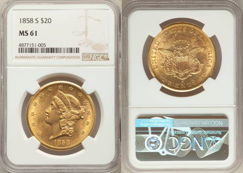 1858-S $20 LIBERTY DOUBLE EAGLE – NGC certified MS61